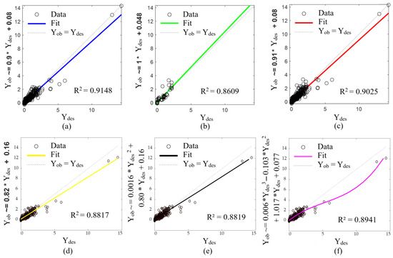 Relationship between predicted (Yob) and target (Ydes) outputs: (a) during training using 95% of the dataset, (b) during validation with 5% of the data, and (c) considering the entire dataset (training + validation), (d) first-degree regression for 100% of samples, (e) second-degree regression for 100% of samples, and (f) third-degree regression for 100% of samples.