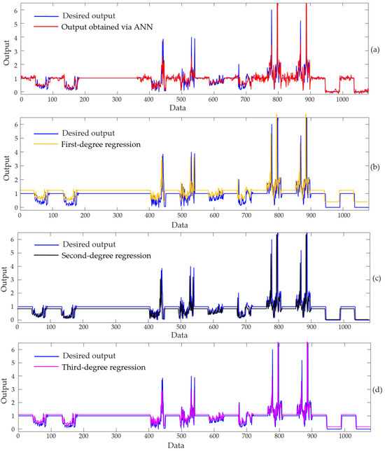 Comparison of the desired output for all samples with (a) the output obtained from the ANN, (b) the output from the first-degree polynomial regression, (c) the output from the second-degree polynomial regression, and (d) the output from the third-degree polynomial regression.