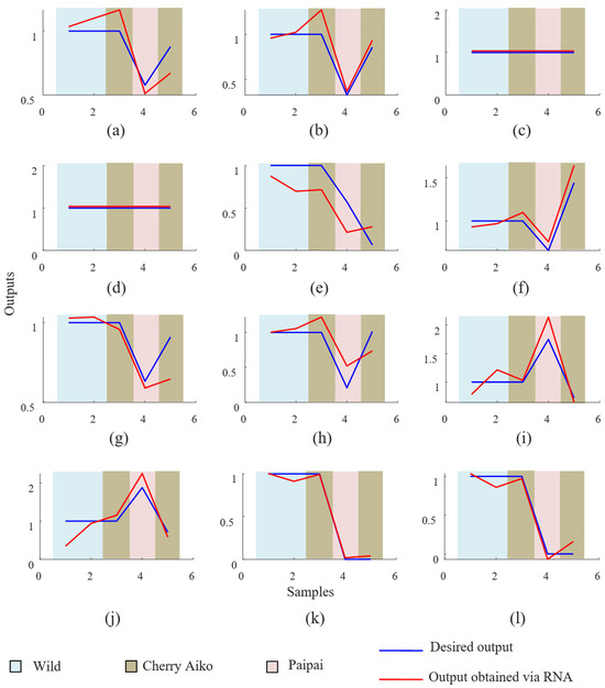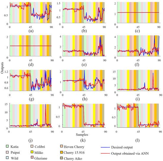 Figure 8a–l display the results for samples that were not part of the training, that is, outputs predicted by the ANN in the validation phase. As it can be seen, there was a similarity between the desired and obtained outputs, evidencing that the network was able to analyze losses in the concentration of bioactive compounds depending on the input data.