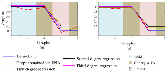Figure 9 shows the results obtained via ANN for the two bioactive compounds that showed the greatest concentration losses, i.e., vitamin C (mg per 100 g) and ascorbic acid (mg per 100 g)—Figure 9a and Figure 9b, respectively. These results refer to samples from the validation phase that were not part of the training. Predictions were compared with first-, second-, and third-degree polynomial regression techniques. As noted, the output that was closest to the desired value was that obtained via ANN (R2 = 0.9025), followed by the third-, second-, and first-polynomial regressions (R2 = 0.8941, 0.8819 and 0.8817, respectively). Equations from the fourth degree on resulted in worse prediction results.