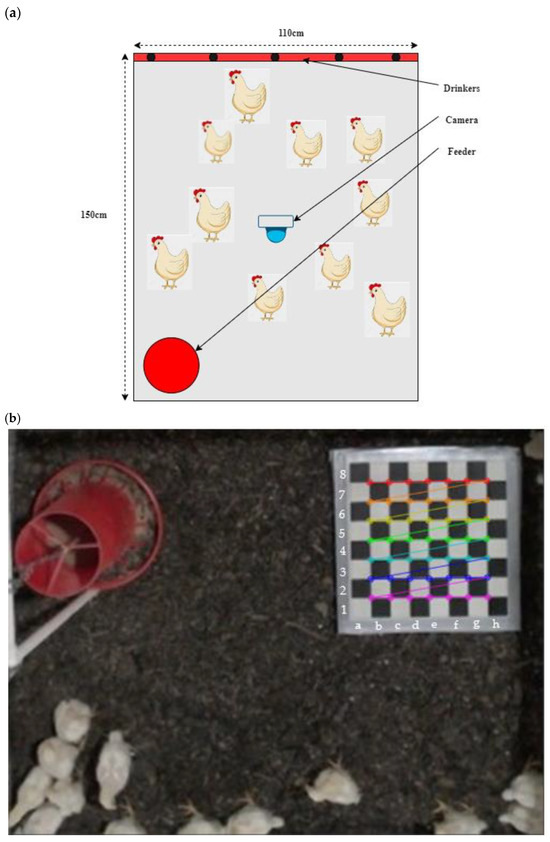 In Figure 1a, the corresponding pen dimensions, 110 cm by 150 cm, along with the position of the standard low-cost RGB camera, feeder with 30 cm pan diameter, and water source, are demonstrated. The camera recorded high-definition (HD) videos at 720p resolution with 30 frames per second rate. It was then used to produce images with a resolution of 1280 × 720 pixels. A systematic sampling approach was followed to gather video recordings at specific intervals daily for the entire experimental period [20]. The camera recorded for 15 min every hour of the day for the period of the experiment. It was positioned 2.2 m above the ground, capturing the pen walls along with a small portion of its surroundings.