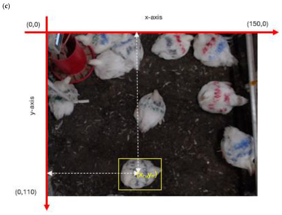 In this study, it was assumed that estimating individual broiler movements every second, i.e., one frame per second rate, would cumulatively provide an overall rich understanding of their mobility. The dataset comprised video recordings spanning eight days, aligning with the days designated for GS assessments. Each day included 13 recordings, captured at 15-min intervals per hour throughout the day. Consequently, the trained model was applied to this dataset, and the (x,y) coordinates of the broilers at each second were obtained from the detected bounding boxes representing each class of broilers, as shown in Figure 1c. These coordinates from consecutive images were then used to calculate the Euclidean distance (d) traveled every second by a broiler. The walking distance, idleness, movement, speeds, and time at the drinker and feeder of individual broilers were calculated using these results by the following Formulas (3)–(9).