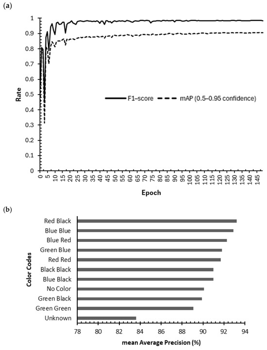 The YOLOv8 model variants were trained, and after many trials and error rounds, the YOLOv8m model with approximately 25 million parameters, achieved up to 91% mAP accuracy with a 0.5:0.95 confidence interval and an F1-score of over 98%. As shown in Figure 2a, both metrics started low and stabilized after the 25th epoch, with the former one continuing to increase incrementally until the final epoch. The selected epoch number, batch size, initial learning rate, and final learning rates were 150, 16, 0.07, and 0.0002, respectively. We opted for the model to learn aggressively from medium-sized batches at the beginning while slowing down at the end epochs. The resulting training process was longer and aimed at obtaining a generalizable and robust model. Moreover, this medium-sized model was computationally less demanding compared with the heavier ones with more than 100 million parameters. Furthermore, it was more reliable than the smaller-sized variants with less than 2 million parameters, which could be prone to overfitting.