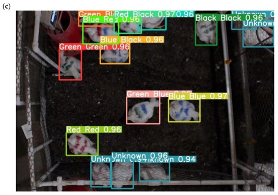 The model was able to track different color codes with high precision. The graph in Figure 2b shows the general validation accuracy in relation to different color codes for this model. As seen, the model behaved differently regarding different color codes; for instance, the codes containing the colors red, blue, and black were differentiated with higher accuracy than other colors. Additionally, as shown in Figure 2c, the model was able to separate uncoded broilers from the surrounding pens and those inside the experimental pen. We achieved the lowest mAP of 83.6% in detecting such birds and the highest accuracy of 93.2% in detecting the Red Black color-coded broiler. Misidentifications might have occurred as some broilers were not fully appearing or showing blurred, or instances where a human by-passer might have caused irregular movements in the pen. These results can help in future applications of color-coding broilers.