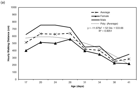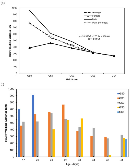 (a) Average hourly walking distances by a broiler over the rearing period (b) Average Walking distance per broiler vs. GS level changes (c) Hourly walking distance of a broiler as affected by GS at different ages.