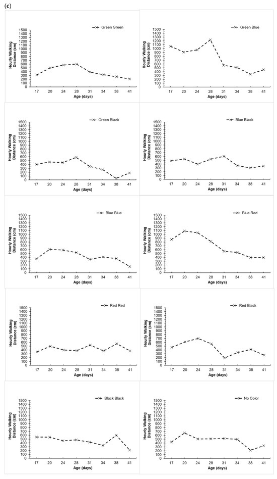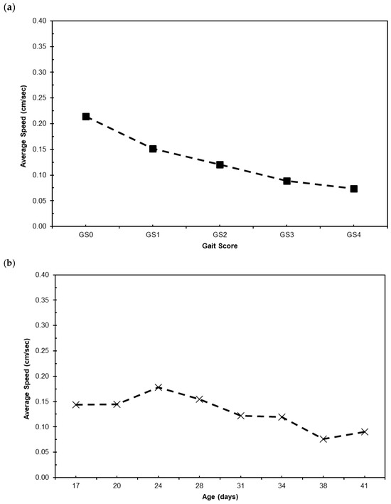 Figure 4a,b illustrates that as GS increased from GS0 to GS4, the average speed declined, indicating that broilers with poorer gaits (higher GS) tend to move more slowly, with the steepest decline occurring between GS0 and GS1. Similarly, as age increased, average speed generally decreased, likely due to factors such as body weight gain. Additionally, Figure 4c graphs of individual broilers revealed a general trend of increasing mobility from 17 to around 28 days, followed by a decline after 31 days. Some broilers, such as Green Blue, Blue Red, and Red Black, showed higher fluctuations, while others, such as Red Red, Black Black, and No Color, maintain relatively stable but lower walking distances. The variations among groups suggest possible individual differences.