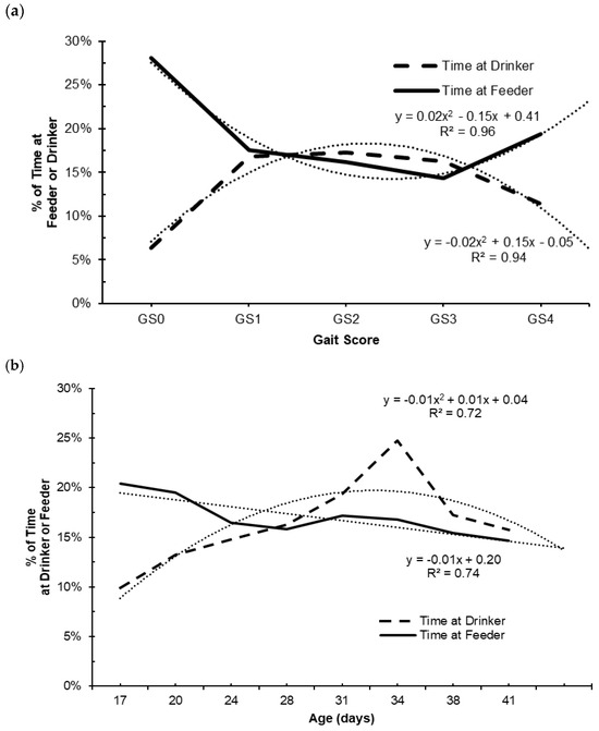 (a) Broilers’ average feeder time per hour per day as compared with GS change (b) Broilers’ average feeder and drinker time per hour per day.
