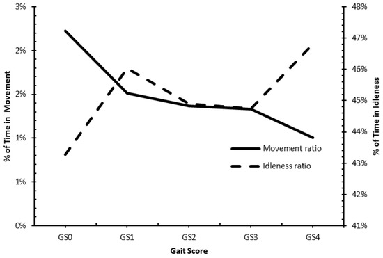 Figure 6 shows the trends in the GS compared with the idleness and movement time ratios. Here, the possible effects of higher GS on boiler level idleness (p = 0.002) and mobility periods (p = 0.007) are more evident; as the broilers showed higher GS levels, they were less likely to move around and more likely to sit idly at a point and hence perform some activities less. Additionally, as demonstrated in Figure 4c as well, here in Figure 6 there has been an overall decrease in the movement of the broilers against increasing GS levels.