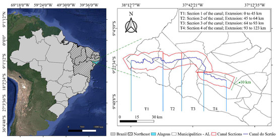 The research analyzed the changes in land use and land cover (LULC) in an area of 1154 km2 (115,493 ha) that is already benefited by the Canal do Sertão Alagoano in the Sertão Alagoano Mesoregion (Figure 1), between the municipalities of Delmiro Gouveia and São José da Tapera. The area corresponds to a strip of land 10 km wide (5 km on each side of the canal’s bank) along the 123 km length of the constructed canal. Of the total length of 250 km, 4 sections have been constructed so far (the constructed route is illustrated in blue on the maps of the state of Alagoas, Figure 1), with a length of 123 km. The LULC changes were analyzed in each section.