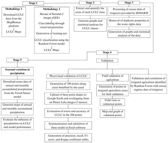 Methodological flowchart of the study, detailing the stages of data collection, processing, and validation of land use and land cover (LULC) data.