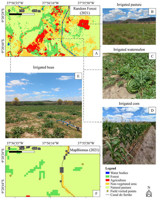 Field validation of irrigated agriculture areas according to the Random Forest model and comparison with LULC from MapBiomas for the same area in 2021. (A) LULC Random Forest 2021. (B) Irrigated pasture area identified in field visits. (C) Irrigated watermelon area identified in field visits. (D) Irrigated corn area identified in field visits. (E) Irrigated bean area identified in field visits. (F) LULC MapBiomas 2021.