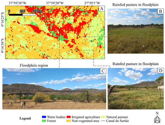 Field validation of irrigated agriculture areas according to the Random Forest model. (A) LULC Random Forest 2021. (B) Rainfed pasture area identified in field visits. (C) Floodplain area identified in field visits. The black dashed square highlights the main area of interest within the floodplain region, where soil moisture accumulates and vegetation remains green during the dry season. (D) Rainfed pasture area identified in field visits.