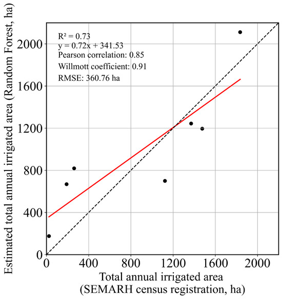 The actual irrigated agriculture data provided by SEMARH and those obtained from the Random Forest model showed a high positive correlation (r = 0.85) (Figure 6). These results indicate a good agreement between the observed data and those estimated by the model. The Root Mean Squared Error (RMSE) revealed that the average deviation between the observed and predicted values was 360.76 ha, highlighting a tendency of the model to overestimate the irrigated agriculture areas, with four points above the 1:1 line. It is important to note that the actual irrigated agriculture data provided by SEMARH may not represent the full extent of irrigated areas, as not all farmers who use water from the Canal do Sertão Alagoano for irrigation are necessarily registered or legalized.