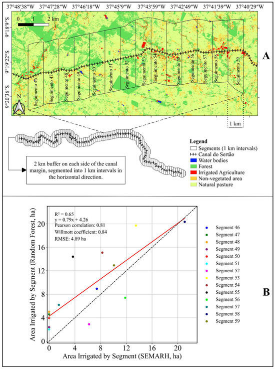 In Figure 7A, the map shows the Canal do Sertão Alagoano with a 2 km buffer on each bank, divided into segments with 1 km intervals. Each segment is numbered (from 46 to 59) and contains the LULC classes for the year 2021. In the drawing below the map, it can be seen that the full path of the canal has several curves. However, the segments are divided by straight vertical lines, regardless of the canal’s curves. This can lead to variations in the sizes of the segments and, in some cases, prevent the irrigated areas from being correctly framed, as these areas follow the winding course of the canal. For this reason, the correlation analysis was carried out only in segments 46 to 59, which represent the most homogeneous areas of the canal. Figure 7B shows the scatter plot, comparing the irrigated area identified by the Random Forest model with the census data of irrigated areas from SEMARH within each segment. The results indicate a strong positive correlation (r = 0.81) between the irrigated areas estimated by the model and the census data, with a coefficient of determination (R2) of 0.65, demonstrating that the model explained 65% of the observed variation. This R2 value can be explained by the possibility that not all irrigators are registered, as registration was carried out through campaigns where irrigators needed to visit registration points. Additionally, there is the limitation of the model in lowland areas, causing spectral confusion. It is observed that when SEMARH recorded zero irrigated areas in certain segments, the model also identified few irrigated areas in the same segments (from 47 to 51).