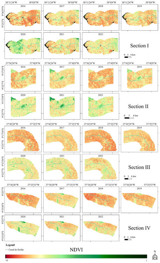 When evaluating the Normalized Difference Vegetation Index (NDVI), higher values can be observed in areas classified as forest. Irrigated agricultural areas also showed higher NDVI values compared to other classes. Non-vegetated areas exhibited lower NDVI values, evident through the redder color in areas where this class is present. Water bodies presented a color tending toward black, with part of the São Francisco River in the western section of the maps in Section I being easily identifiable, where water from the canal is captured. In wetter years such as 2020 and 2022, the NDVI shows a visible increase (Figure 8). In drier years, the red color intensifies, indicating a decrease in NDVI due to the increase in exposed soil and the loss of vegetation quality.