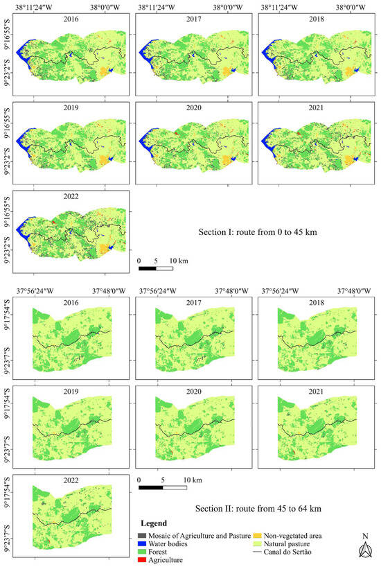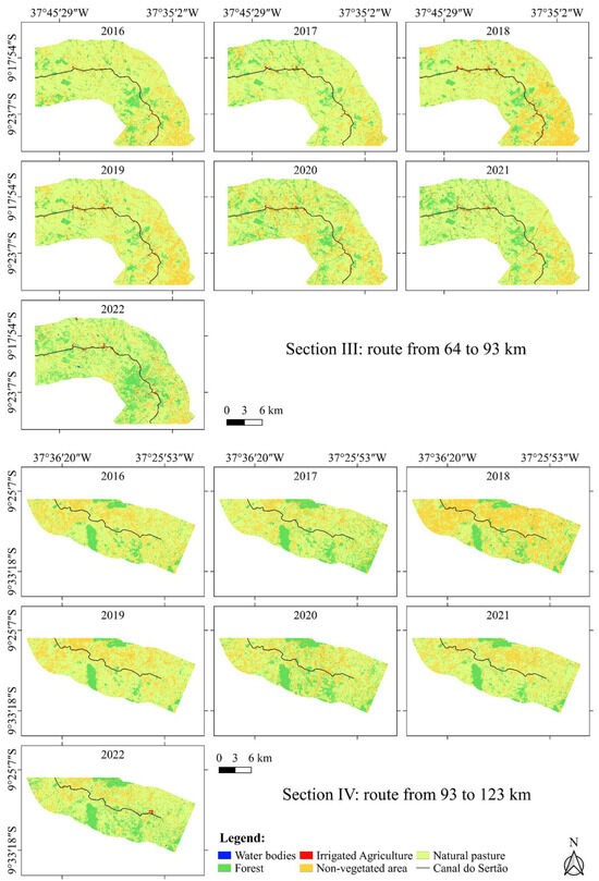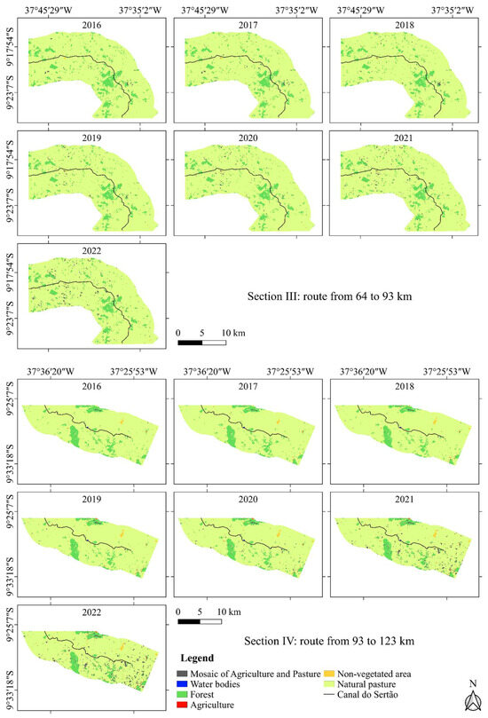 Section I of the Canal do Sertão Alagoano exhibited the most noticeable land use and land cover (LULC) change (Figure 10). At the eastern end of the map, a small part of the São Francisco River can be seen, where the system that captures water and transports it to the canal’s starting point is located, continuing its path by gravity. The expansion of the “Mosaic of Agriculture and Pasture” class is noticeable, which represents areas of agricultural use where it was not possible to distinguish between pasture and agriculture. The areas recognized as agricultural are scarce and small in size. Pasture is the predominant class throughout the entire evaluated period and represents a natural vegetation of the Caatinga, with herbaceous and/or shrub plants. Section II is the shortest section of the canal, at only 19 km, where the dominance of forest and pasture classes is also observed (Figure 10). It is noted that agriculture remains very limited in area. The “Mosaic of Agriculture and Pasture” class, which may include some agriculture, occupies a larger area than the areas exclusively classified as agriculture in these sections, although it is still small compared to other land uses.