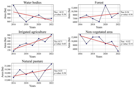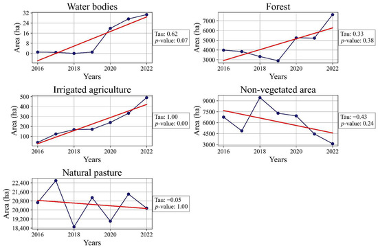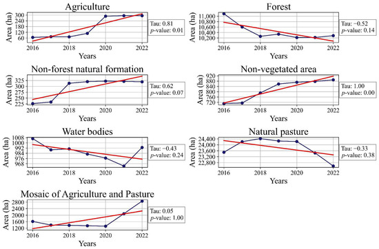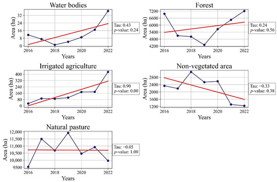 Temporal trends and Mann–Kendall analysis for land use and land cover classes in hectares generated by the Random Forest model in Section IV of the Canal do Sertão Alagoano (2016–2022). The blue line represents the estimated data, and the red line represents the trend line for each class.