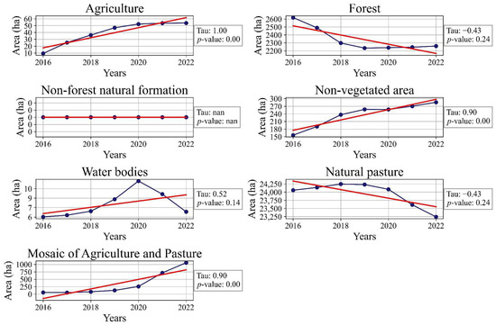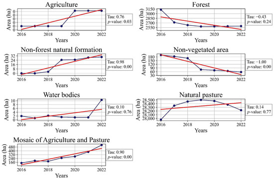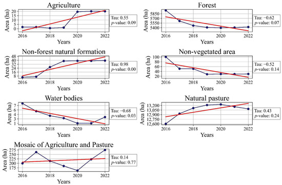 Temporal trends and Mann–Kendall analysis for MapBiomas land use and land cover classes in hectares in Section II of the Canal do Sertão Alagoano (2016–2022). The blue line represents the estimated data, and the red line represents the trend line for each class.