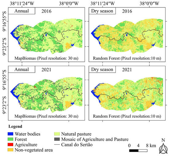 Comparison between the MapBiomas and Random Forest LULC maps for the years 2016 and 2021 in Section I of the Canal do Sertão Alagoano.
