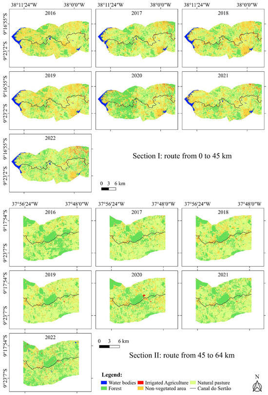 Figure 25 shows the contrast between the years 2016 and 2022, representing a dry year and a rainy year, respectively. The year 2016 was a dry year throughout the north-eastern region of Brazil, and as seen in Figure 25, the three months of the period used to generate the Sentinel-2 mosaic for this study were extremely dry. This is reflected in the vegetation, as observed in the LULC map for this year, where the presence of non-vegetated areas stands out and predominates in much of the map for Section I of the canal. In that year, non-vegetated areas totaled 13,265.13 ha, while forest and natural pasture covered 7805.21 ha and 16,098.16 ha, respectively. Irrigated agriculture was minimal, with only 100.99 ha, and water bodies totaled 945.68 ha. The year 2022 is the opposite, with rainy months during the dry period evaluated, which influenced the increase in forest and pasture areas. Forest reached 9655.11 ha, natural pasture expanded to 21,769.26 ha, and non-vegetated areas decreased to 4996.03 ha. Irrigated agriculture also grew, occupying 918.18 ha, while water bodies slightly reduced to 876.59 ha. This demonstrates how the Caatinga, the exclusive biome of Brazil’s semi-arid region, is versatile and adapts to climatic conditions. The Caatinga forest loses its leaves during the dry period to stay alive, reducing energy expenditure and water loss. On the other hand, even small amounts of rainfall are capable of changing this scenario, with the vegetation turning green again through rapid leaf growth and development of this highly adapted native vegetation.
