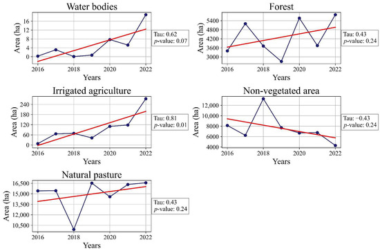 The irrigated agriculture class showed a significant growth trend in Section III of the canal (p < 0.05), with a τ value of 1, demonstrating constant growth, increasing from 38 ha in 2016 to approximately 491 ha in 2022 (Figure 21). The natural pasture class did not show a significant growth or decrease trend according to the Mann–Kendall statistical analysis (p > 0.05).