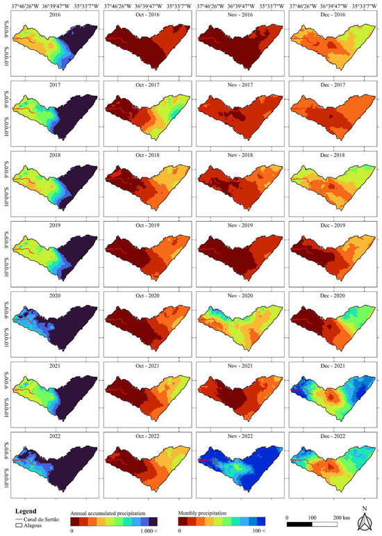 Annual and monthly (October to December) accumulated precipitation maps from the TerraClimate model for Alagoas (2016–2022).