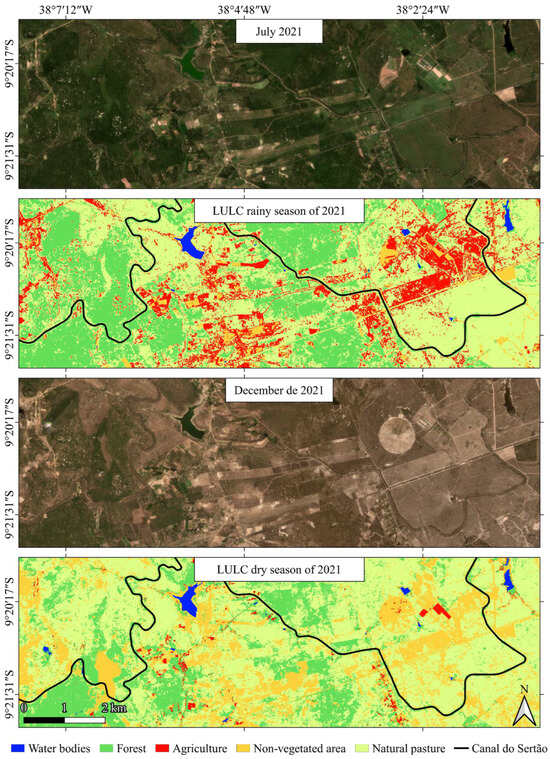 Contrasting LULC maps comparing the wet and dry periods in an area of the municipality of Delmiro Gouveia near the Canal do Sertão Alagoano in the year 2021.