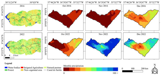 LULC maps of Section I of the Canal do Sertão and monthly precipitation during the dry period for two contrasting precipitation years (2016 and 2022).