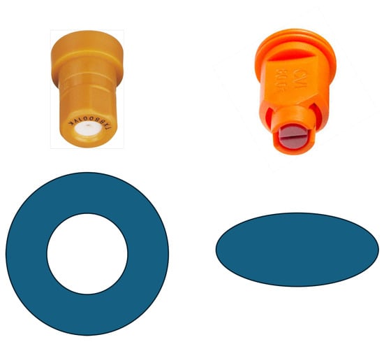 The experiments involved two sets of different nozzles, differing by mechanism of action and spray geometry: one was a conventional, hollow-cone model TXB8001VK by Teejet® Technologies (Wheaton, IL, USA), henceforth “HC”; and the other was an air-inclusion, flat fan model CVI8001 by Albuz® Spray (Solcera, Evreux Cedex, France), named “AI” in the following. The nozzles and respective spray shapes are shown in Figure 1. For the scopes of all tests of the present study, clear, tap water without visible solids in suspension was sprayed through the nozzles at 700 . This choice was made to maintain consistency with the previous work, which employed the same nozzles at the same pressure.