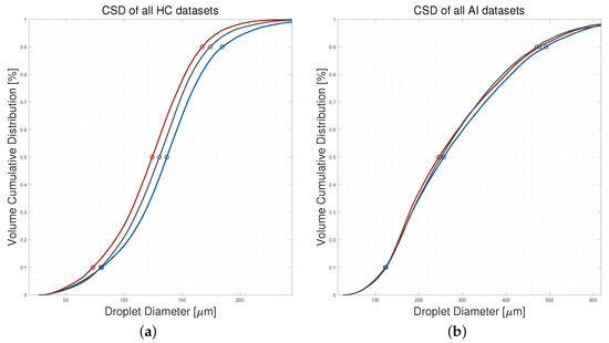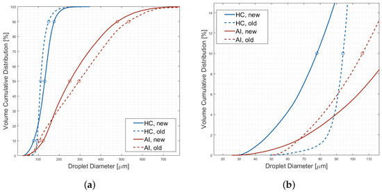 The three original datasets used to fit HC (a) and AI (b) nozzle data, as extracted by the N60 automated test report. The continuous lines represent the cumulative distributions and are obtained by linear interpolation between consecutive data points; the circles identify the 10th, 50th, and 90th volume percentiles.