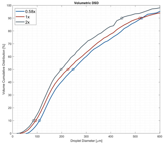 The information gathered from the CSD data of a nozzle can indicate (i) which fraction of the output volume is contained in droplets whose diameter is less than a specific threshold, and (ii) how accurate the nozzle is in generating droplets of a specific diameter, limiting the generation of coarser or finer ones. Since the dimension of a droplet (more specifically, its surface-to-volume ratio [29]) immersed in air substantially determines the time the droplet will spend mid-air [30], it is well known that finer droplets will be more susceptible to drift away from the treated area. Therefore, the volume fraction, denoted as , where y is the corresponding diameter in μm, can aid in assessing the “driftability” of a nozzle, once a suitable threshold has been defined. The many parameters involved in the problem of drift [31] make it unreasonable to find a universal threshold, so a wide range of thresholds can be found across the literature, usually ranging from used in [32] to employed in [24]. The second piece of information, i.e., the ability to generate droplets of a specific diameter, is effectively conveyed by the volume percentiles, referred to as dVx, where . ISO 25358 defines the dVx as the “droplet diameter where the fraction” x “of the spray volume is in smaller droplet sizes”; in other words, x part the output volume resides in droplets of at most dVx n diameter. The Relative Span (RS) is a measure of how dispersed the DSD is, and is calculated from the volume percentiles as follows: