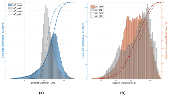 Comparison of volumetric DSD and CSD of nozzles across the two methodologies. The gray histograms and dashed lines refer to the old methodology: (a) HC (TXB8001) and (b) AI (CVI8001) nozzles. The scale on the left of each plot is referred to the histograms, on the right to the cumulated curves.