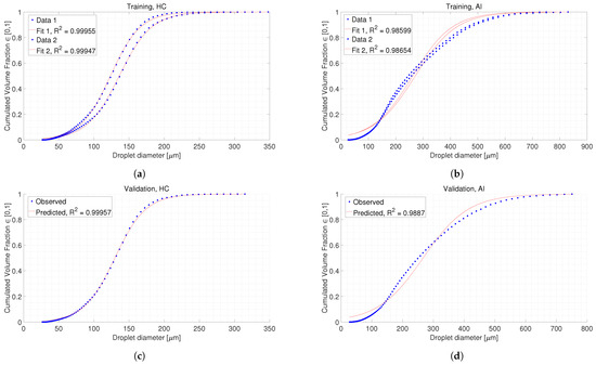 Given the good quality of the fits described above and the similarity in the datasets shown in Figure 2, it is to be expected that the validation of the model would respond very well. Figure 6c,d visualises the ability of the constructed models to predict the CSDs of HC and AI nozzles, respectively. The highly satisfactory GoF values are summarised at the bottom of Table 4.