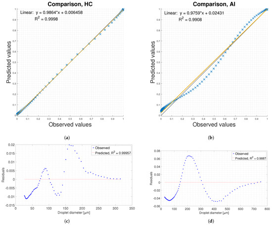 Figure 7a,b compares the values predicted by the averaged fitting models with the respective observed points. In other words, for every observed value (that is, every data point obtained from the PDIA presented on the abscissa, the predicted value at the corresponding diameter is plotted. An ideal, perfect fit would configure a straight diagonal line in this type of plot. The straight line interpolating the data points would need to have a slope as close to 1 as possible, and an intercept as close as possible to 0. This type of visualisation is very illustrative of the irregularities in the observed data, and of how able a fit can be in representing those irregularities. Figure 7a,b also presents the interpolant lines (yellow) and their equations: for HC, this line is virtually indistinguishable from the x-y diagonal, whereas for AI, a slightly off slope and a non-zero intercept remark the considerations outlined above.