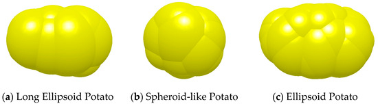 To acquire relatively accurate potato shape parameters, three potatoes of different shapes with masses close to the overall sample average of harvested potatoes were selected. Three-dimensional scanning technology was employed to establish three-dimensional mesh models of these potatoes. The models in STL format were imported into EDEM 2022 software, and subsequently, potato discrete element models were obtained through the granule auto-filling method, as shown in Figure 5.