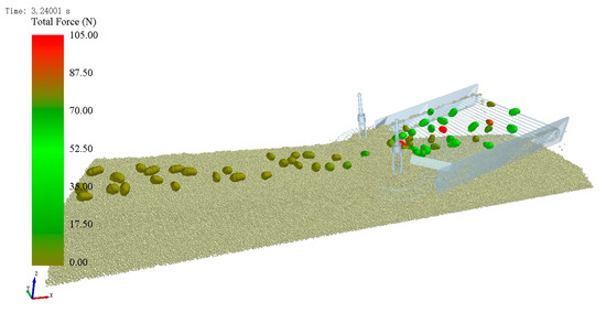 Based on References [22,23,24,25] and the empirical test results, potatoes are deemed bruised when their maximum contact force during collisions reaches or exceeds 150 N, which may cause epidermal or tissue damage. Force analysis on potatoes was conducted in EDEM 2022. The parameters were as follows: disc rotation speed: 55 rpm; disc inclination angle: 16°; and machine forward speed: 0.6 m/s. The force profile of a potato at 3.2 s simulation time is shown in Figure 9. The results indicate that the contact force significantly increases to 150 N when the potato disengages from the pickup disc and interacts with the elevator chain.