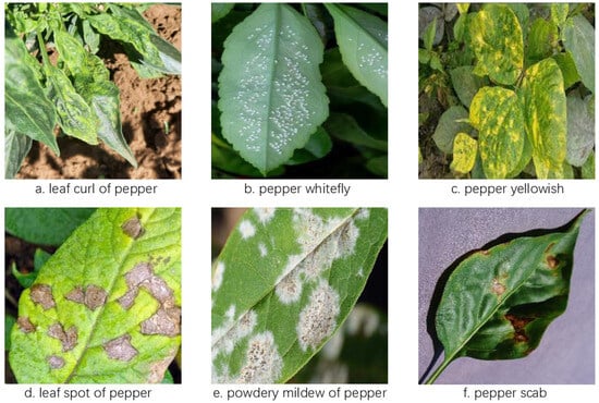 The images used in the experiment were taken in the chili pepper experimental park of Northeast Agricultural University’s Smart Agriculture, and the acquisition device was a Huawei P50 smartphone with a resolution of 1224 × 2700 pixels. Considering the different light conditions of the growing environment of chili peppers and the shading of their own characteristic conditions, the images were taken under different weather and environmental conditions, including sunny days, after rain, field of view overlap, shading, smooth light, backlight, changing angles and distances, and so on. This was with the aim to enrich the diversity of data and improve the model’s generalization ability as much as possible as well as to improve the recognition ability in complex environments [15,16]. This study expands the dataset by sourcing additional data from the internet. A total of 8987 images were collected, and the images of pepper disease leaves were taken as shown in Figure 1.