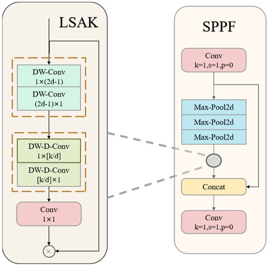 The Large Selective Kernel Attention (LSKA) module decomposes standard 2D convolutions into cascaded horizontal and vertical 1D depth-wise convolutions, significantly reducing computational and memory costs [25]. Unlike LKA, LSKA incorporates both spatial and channel attention mechanisms while maintaining long-range dependencies. By leveraging kernel factorization, LSKA avoids the quadratic increase in computation associated with large kernels, achieving comparable performance to LKA with greater efficiency. The structure of LSKA is illustrated in Figure 7.