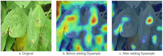 From Figure 9, it can be seen that after adding the lightweight DySample sampling operator, the model’s capture of the correct target is improved, which is shown by the fact that the color of the correct target is brighter than the others, and the color of some regions is redder, which shows that the model pays attention to the target region in the image and the confidence of the prediction results is higher [30].