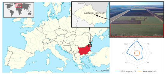 It is located in the geographical region of Dobrudja. In terms of climate, the experimental area belongs to the eastern part of the Temperate Continental climate region of the Republic of Bulgaria. Its specificity is determined by the plateau-like nature of the relief, which is a low plateau with an altitude of about 200 m, and the constantly blowing winds due to the proximity of the Black Sea. The regional climate is described based on long-term climatic norms. The coldest month is January, with an average temperature of −0.5 °C. While winters are relatively harsh, extremely low temperatures are uncommon. For illustration, the absolute minimum air temperature of −22.7 °C was recorded in 1954, marking one of the coldest years.