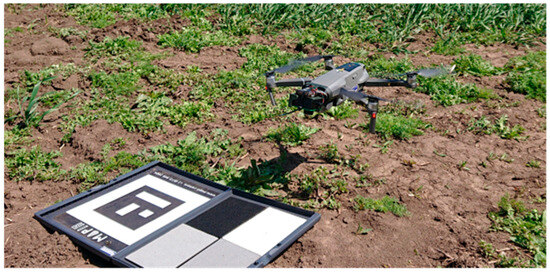 The experimental data were acquired using an unmanned aerial vehicle (UAV) from DJI, specifically the Mavic 2 Pro model [32]. It has a Hasselblad L1D-20 camera, featuring a 20.1 MP 1” CMOS sensor that captures images in the RGB range. Since the NDVI is derived from the red and near-infrared light spectra, the built-in camera of the UAV cannot be used to capture these wavelengths. To address this, a second external Mapir camera [33] was mounted on the UAV, capturing images in the RGN (red–green–near-infrared) spectra. The Mapir camera’s specifications include R (red) at 660 nm ± 10 nm, G (green) at 550 nm ± 10 nm, and N (near-infrared) at 850 nm ± 20 nm, with a Sony Exmor R IMX117 sensor (12 MP, 4000 × 3000 px), featuring a Bayer matrix where the blue channel is repositioned in the near-infrared spectrum. The UAV is shown in Figure 2, which also illustrates the Mapir calibrator used to correct for variable sunlight intensity. The multispectral survey was conducted at a height of 100 m above the ground with 80% overlap in horizontal and vertical directions. The flight speed was limited to 10 m/s. The camera settings included a focal length of 3.0 mm, a shutter speed of 1/500, an aperture of f/2.8, and an ISO of 100, all set with fixed parameters.