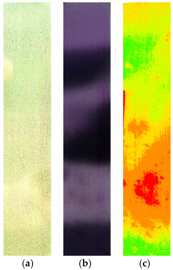 The experimental field area is 68 × 360 m. An orthomosaic of the field in RGB is shown in Figure 3a. In Figure 3b, an orthomosaic in the RGN spectrum is shown, and in Figure 3c, an NDVI map.