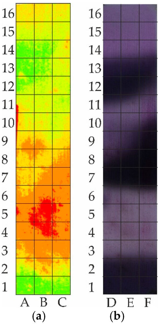 The field is divided as shown in Figure 4, with Figure 4a presenting its NDVI map. The field is divided into three zones (A, B, and C) along its width and into 16 zones (marked 1–16) along its length. This division results in plots of size 22.5 × 22.6 m. The camera used for imaging has a resolution of 12 MP and a Sony Exmor sensor with a 2:3 aspect ratio. The images were captured from a height of 100 m above the terrain. The resulting NDVI map has a resolution of 150 × 800 pixels, with a ground resolution of 4 cm per pixel. Applying the corresponding division from Figure 4a, squares of 50 × 50 pixels are obtained. Figure 4b shows an RGN orthomosaic of the studied field, divided into three zones (D, E, and F) along its width and 16 zones (marked 1–16) along its height, forming zones of 50 × 50 pixels each.