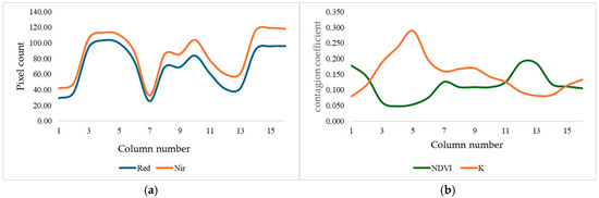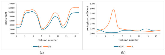 The results for column A are presented in Figure 6, where Figure 6a shows the number of pixels from each square in column D of Figure 4. Figure 6b displays the generated average NDVI value and the contamination coefficient. The NDVI is derived from the average values of the colors in the divided areas shown in Figure 4b. It can be observed that a decrease in the NDVI, combined with an increase in the amount of red, is indicative of the presence of yellow rust.