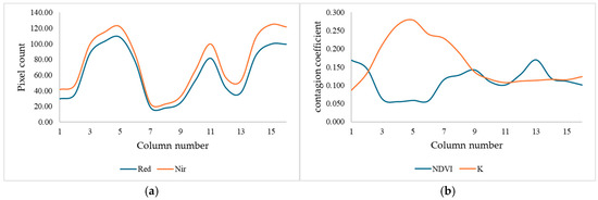 A quantitative assessment of the values in each square of the NDVI map is conducted using ImageJ software v. 1.54p [37]. The number of pixels corresponding to each of the three-color categories is analyzed in each square. These values are used to calculate a contagion coefficient, denoted as K, using the following formula: