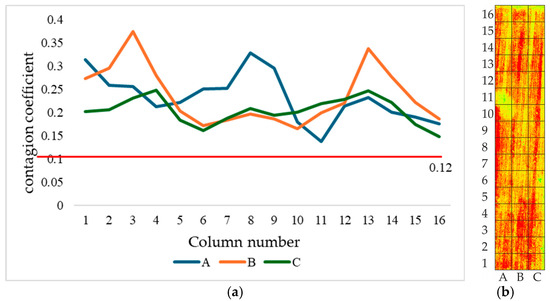 Figure 11 illustrates the values of the infection coefficient on June 30, 25 days after the initial diagnosis of early-stage infection. Figure 11a shows the variation in the coefficient across different plots for each column of the study plan. The graph indicates that all plots exhibit an infection degree within the range of 0.2–0.4, exceeding the threshold value for pathogen presence. Field observations confirmed the widespread spread of yellow rust, followed by the subsequent wilting of the affected plants. The decline in NDVI values corresponds to the wheat entering the maturity stage and the cessation of vegetation.