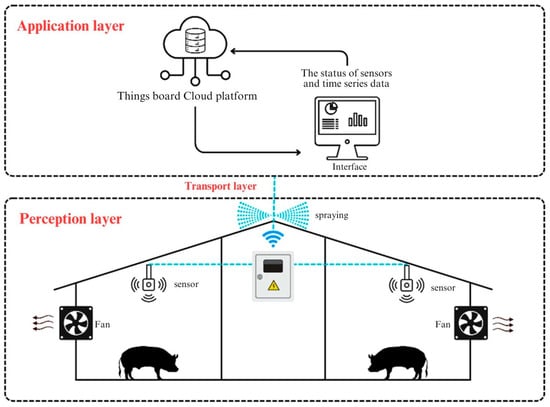 The transport and application layers handle the transmission and management of these data. The collected sensor data are uploaded to an IoT platform (Things Board) via the Internet, where it is stored in a centralized database. The platform also displays real-time operational statuses of the sensors, indicating whether they are online or offline. Additionally, time-series data for each parameter are accessible on the platform, enabling users to continuously monitor sensor performance and data accuracy. This system allows for effective and ongoing environmental management in pig housing through the continuous monitoring of critical environmental factors.
