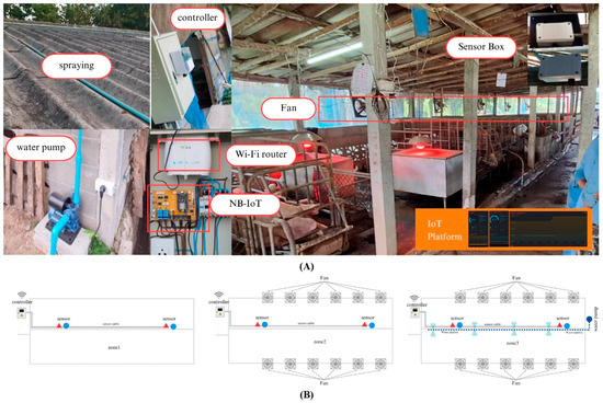 Figure 2 illustrates the research environment and the installation of the system in this study. An Internet of Things (IoT) system was installed in the pig house to regulate the environment and ensure optimal conditions for pig farming. The system consists of a controller for processing and managing connected devices, a sensor box for monitoring environmental parameters, ventilation fans to reduce temperature, and a spraying system that operates in conjunction with a water pump to regulate humidity and provide cooling. Sensor data are transmitted via wired connections to the NB-IoT system and displayed on an IoT platform using a Wi-Fi router for real-time analysis and control. The system is installed in different zones, as illustrated in the schematic, allowing efficient environmental regulation within the pig house. For air quality monitoring, temperature, humidity, NH3, and H2S sensors were installed at the front and rear sections of the pig house inside sensor boxes, which were designed with probe extensions to minimize the effects of moisture and dust. The sensor boxes are mounted on beams beneath the gable roof and connected via wired connections to the NB-IoT system. The installation locations were selected based on areas with a high likelihood of gas accumulation to ensure accurate data collection. This information is then utilized to optimize the environmental conditions within the pig house, enhancing the efficiency of pig farming operations.