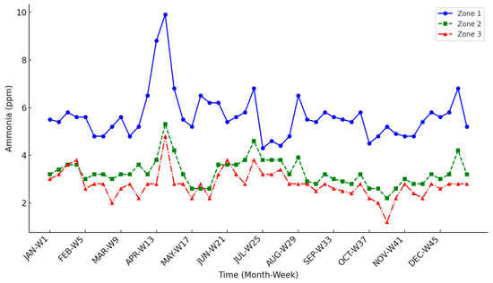 The results of the analysis of ammonia levels across Zones 1, 2, and 3 underscore the critical role of environmental management in mitigating ammonia emissions within pig farming operations. Zone 1 exhibited the most significant fluctuations in ammonia concentrations, likely driven by elevated temperatures and suboptimal ventilation, posing a potential risk for exceeding permissible thresholds in the future. In contrast, Zone 2 demonstrated greater stability in ammonia levels, suggesting more efficient waste and ventilation management. Zone 3, with the lowest and most stable ammonia concentrations, reflects superior environmental controls and underscores the efficacy of comprehensive ventilation strategies.