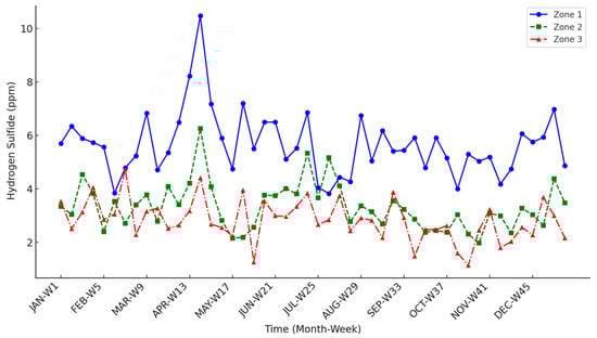 To determine which specific zones differed, Dunn’s post-hoc test with Bonferroni correction was applied. The results showed that Zone 1 had significantly higher concentrations of both NH3 and H2S compared to Zones 2 and 3, confirming more intense gas accumulation in that zone. Zone 2 also had higher levels than Zone 3, though to a lesser extent. These statistical findings are visually supported by the boxplots in Figure 5c, which clearly depict variations in medians and data ranges across zones.